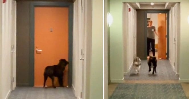 I videon kan man se hur den ena hunden när ytterdörren öppnas rusar ut i korridoren. Sedan ställer hon sig utanför grannens dörr och väntar på sin kompis.