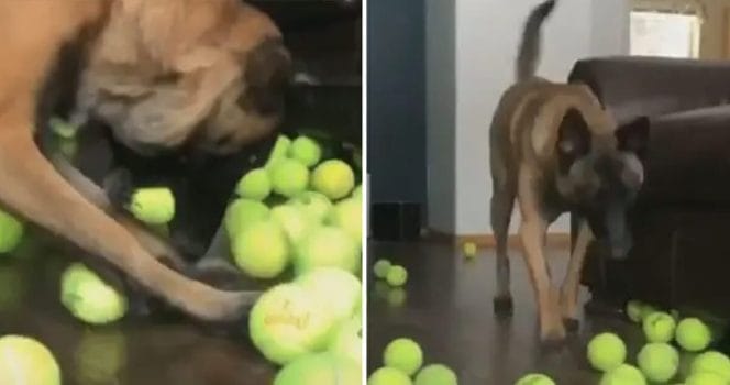Hunden Titus fick inte bara en tennisboll i födelsedagspresent. Han överraskades av matte Alistair Clyde med 400 tennisbollar – och glädjen när alla släpptes ut visste inga gränser.
