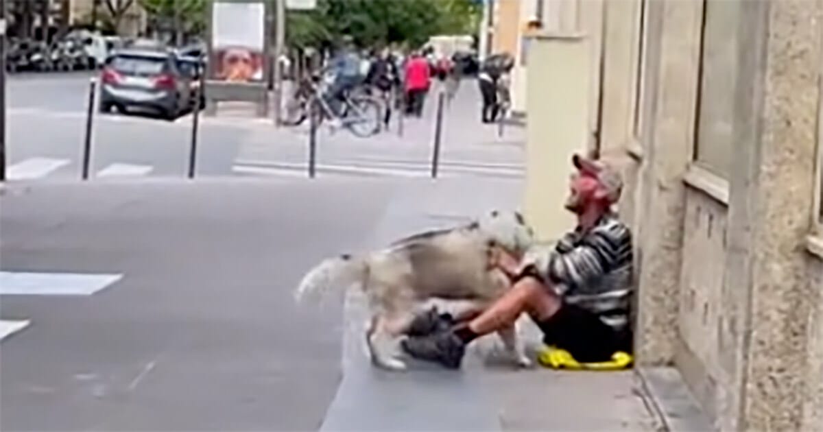 Sora rusade fram mot den hemlösa mannen och vägrade lämna honom, trots att hans husse kallade på honom om och om igen.