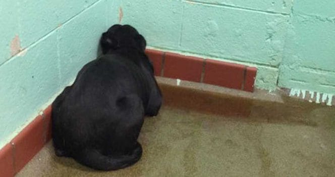 Den här bilden är en av de mest tragiska bilder jag sett. En hund övergiven av sina ägare – stirrar in i väggen förstenad av rädsla.