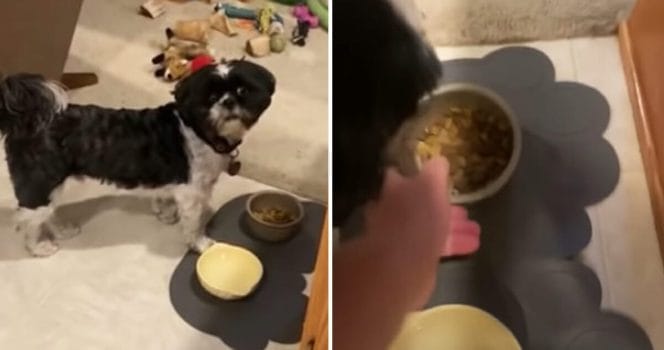 Det uppmanar den här hundägaren, vars fyrbenta familjemedlem vägrade röra sin hundskål. Husse hade fyllt den lilla grå metallskålen med mumsig hundmat – men vovven verkade inte nöjd. Efter en hel dag ville hunden, som heter Nitro, ändå inte äta.