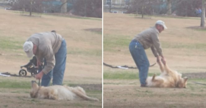 Ägaren är tålmodig, han gör allt för att få den tokiga hunden att ställa sig på benen igen. Han drar lite i henne, masserar hennes ben, vaggar henne fram och tillbaka, försöker få henne att lägga sig på mage. Men inget hjälper.