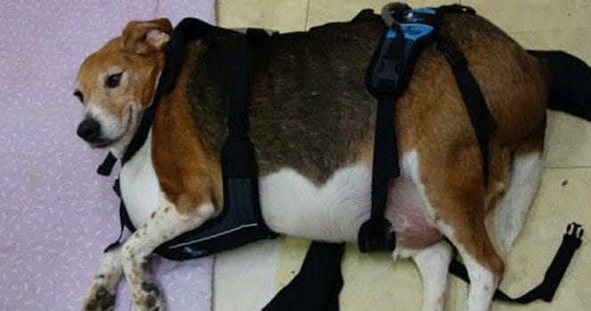 Vid den här tiden var han åtta år och vägde närmare 40 kilo, uppger Paw my gosh. Alldeles för mycket för den lilla stackars kroppen att bära.