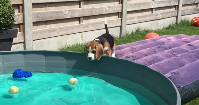 Videon visar hur två beaglar har en härlig och avkopplande dag i solskenet vid poolen. De har en luftmadrass och en barnpool med mängder av leksaker.
