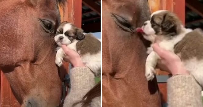 Ägaren håller i sin urgulliga hundvalp och låter honom träffa hästen. Som i sin tur verkar tycka att det hela är väldigt gosigt. Se bara på den vänskapliga och varma kramen mellan de båda i videoklippet här nedan. Till slut vågar sig lille Vily också på att pussa på sin nya bästa vän.