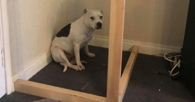Hunden Buster stängdes in i ett hörn av Husse som började att bygga stommar.