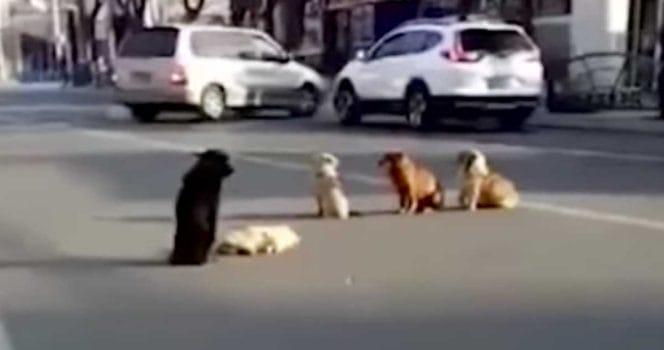 Hunden som blev påkörd var inte ensam, han hade fyra hundkompisar med sig. Kompisarna klarade sig oskadda över vägen, men när de såg att deras kompis blivit påkörd vände de tillbaka och satte sig ner bredvid honom.