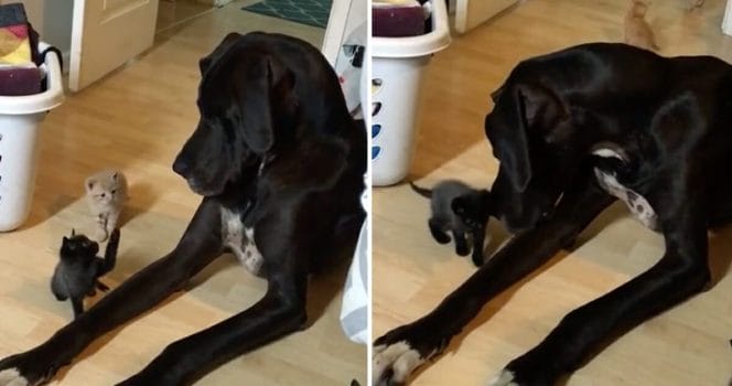 Han låter de små kattungarna komma närmare och verkar inte ha någonting emot deras sällskap. I stället är han väldigt försiktig – och situationen där hunden klappar den lilla kattungen med sin tass är verkligen helt underbar.