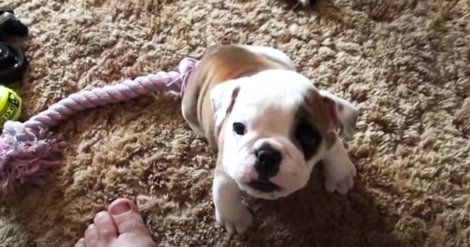 Det verkar som om hundägaren, som har en jätteliten hundvalp av rasen bulldog i sitt hem, försöker lära henne sitt namn.