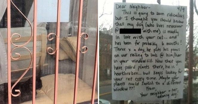 ”Kära granne, det här kommer att verka löjligt, men jag tänkte att du borde veta att min hund (som bor mitt emot på [adress] med mig) är galet förälskad i din katt… och har varit det i säkert 6 månader!”
