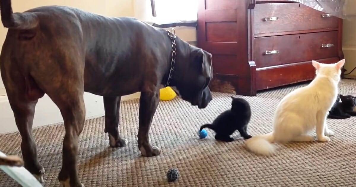 I det här exemplet ska vi titta på hur viktigt det är att vara snäll om man är stor… Den här pitbullen heter Manny och väger närmare 45 kilo. Kattungarna som befinner sig i samma rum är långt mycket tunnare.