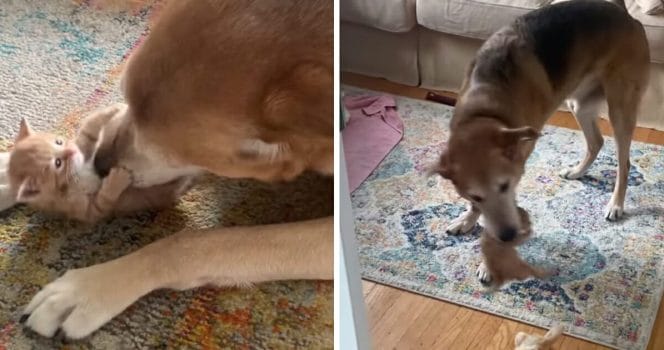 Kattungen vill busa med sin ”fosterpappa” – hundens reaktion smälter hjärtan över nätet