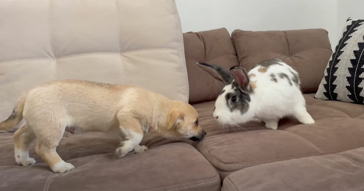 Det är Youtube-användaren The Fluffiest som skriver att detta är första gången som djuren överhuvudtaget möts. Tittarna får se hur kaninen närmar sig den lilla hundvalpen på den mjuka och bekväma soffan.