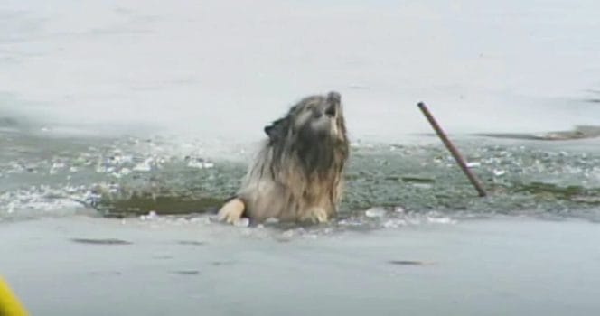 Det var personalen på brandkåren i Delaware, USA, som ryckte ut på detta larm och lyckades fånga in den frusna och rädda hunden. De dramatiska bilderna har visats miljontals gånger på nätet.