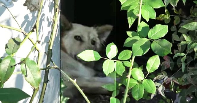 Hunden låg bakom en husvägg och huttrade när ett vittne ringde in till djurskyddet. Snart kom de till platsen, men de visste då inte mycket mer om hunden än att det var en ljus, golden retriever som inte ville komma fram från buskaget och låg intill en husvägg.