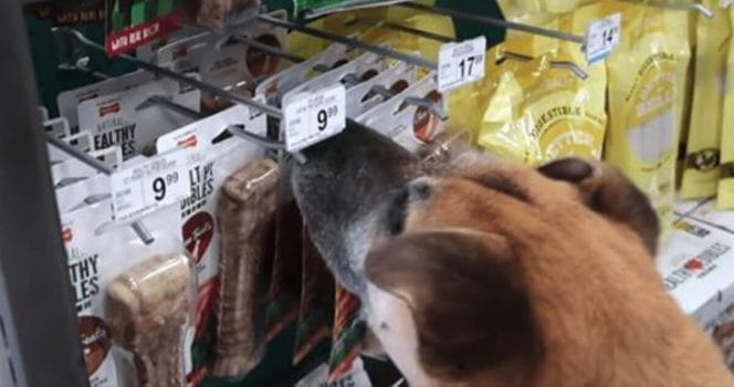 Han gick fram och nosade på leksakerna tills han hittade det han ville ha.