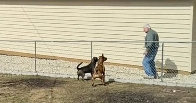 I videon syns hur de två hundarna sitter och väntar på grannen och hur lyckliga de blir när han väl kommer ut till dem.