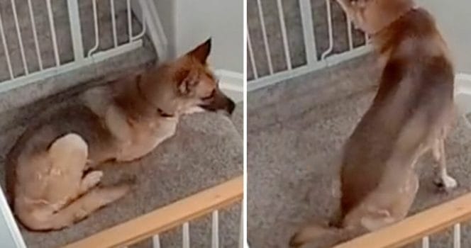 Händelsen har fångats på en kamera inne i huset. I klippet syns schäfern ligga lugnt nedanför trappan invid den stängda grinden.