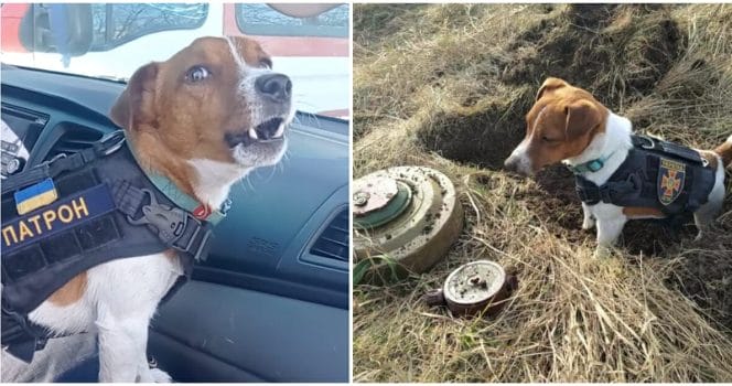 I ett viralt videoklipp som delas av Ukrainas statliga räddningstjänst, kan man se hur en hund som heter Patron och är ”maskot” för explosionsexperter i staden Tjernihiv. Hunden är speciellt utbildad för att sniffa upp ryska sprängladdningar.