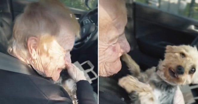 När hunden får syn på den äldre kvinnan efter en tid isär går glädjen inte att missa.