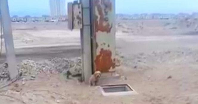 Hundägaren tog fram kameran och filmade mötet med den mystiska och ensamma valpen som satt bredvid hålet. Ingen människa eller annan hund fanns i närheten av honom. Åtminstone inte ovan jord.