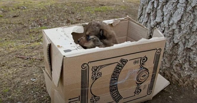 Lådan hittades av en okänd man som var ute på promenad. Han ringde till djurhjälpen och väntade sedan med hundvalparna i en timme.