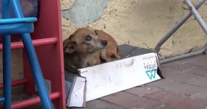 Den vettskrämda och helt övergivna chihuahuan hade bosatt sig i en liten skolåda utanför ett hus. Det var så nära ett eget hem valpen kunde komma och där kände hon sig säker. Husägarna noterade givetvis detta och började mata henne varje dag så att hon kunde överleva.