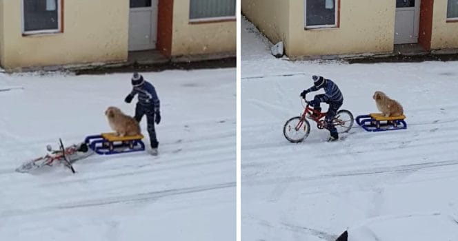 Många grannar tyckte det var roligt att se pojken med sin hund ute i snön. Därför valde en grannförening att samla ihop pengar – så att grabben skulle få en ny cykel att köra runt hunden med.