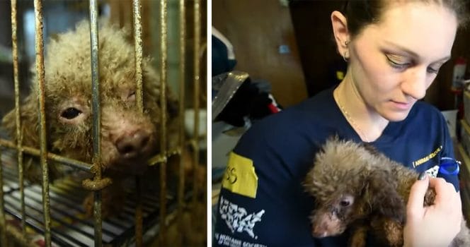 Pudelns svullna bröstkörtlar tydde på att hon endast använts för avel och har levt sitt liv instängd i buren. Hon var väldigt rädd och hade aldrig haft kontakt med människor.