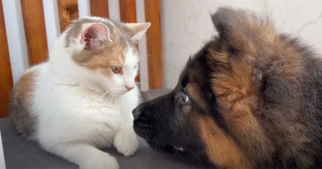 Därefter uppstår vad som tycks vara en härlig vänskap. Hunden tar initiativet och går närmare katten som först ryggar tillbaka.