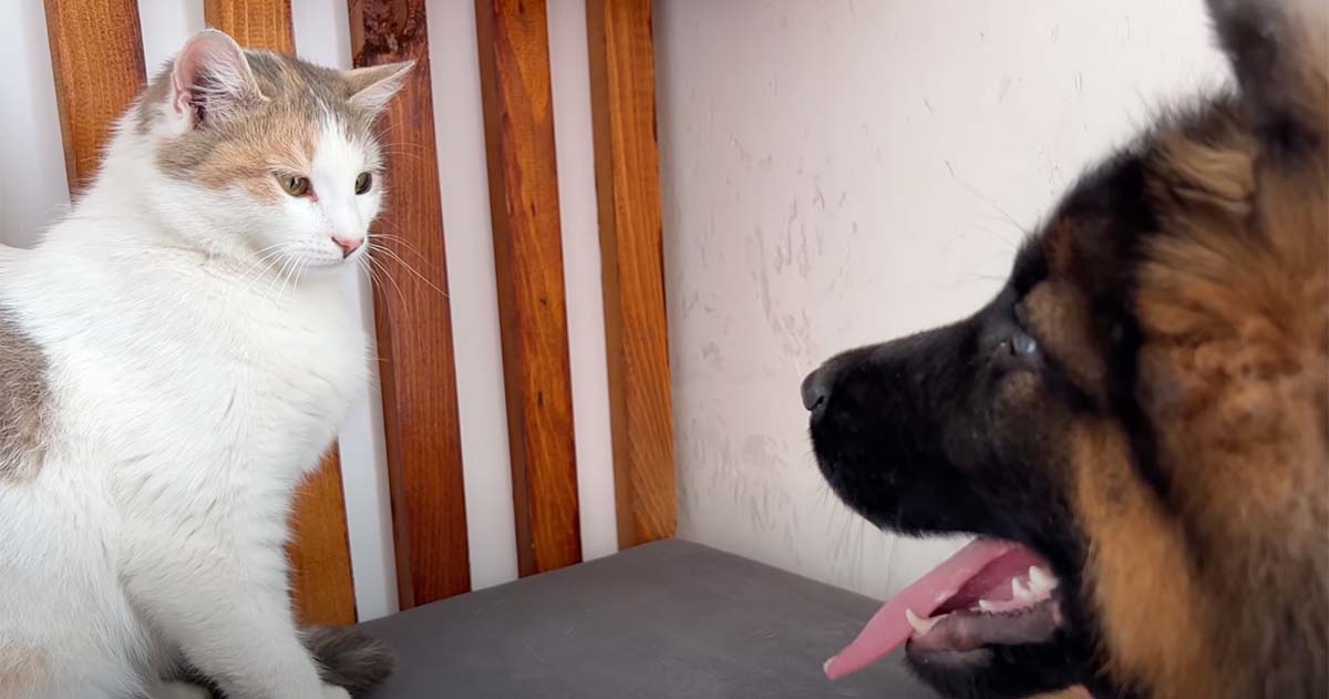 Det ser ut att ta ett tag för katten att smälta vad som egentligen händer, men den här vovven är en riktigt snäll en. Till slut blir det bara kärleksfullt och härligt – se efter själv i klippet här nedan.