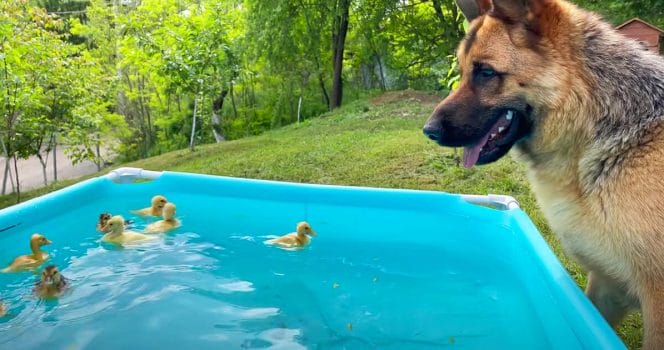 Schäfern Rocky fick en dag syn på någonting ovanligt i poolen. Däri flöt flera små kycklingar. Den stora hunden tittade storögt omkring sig.