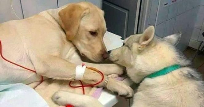 Det påstås i alla fall på internetforumet Reddit där användaren u/Obito_GF lade upp den här bilden. Den ska komma från en veterinärklinik där en sjuk hund får tröst – av en terapihund.