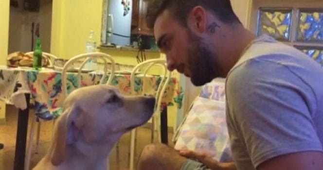 Först så tittar han sin vovve djupt i ögonen, och säger ingenting, innan hunden Ettore tittar bort. Stackarn måste ha känt sig skyldig…