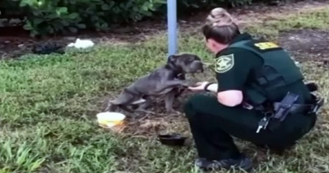 Tidigare denna månad åkte polisen Angela Laurella från Broward Sheriff’s Office ut på ett larmsamtal om en allvarligt undernärd hund som var fastbunden på en stolpe.