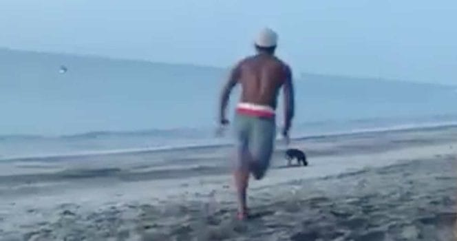 Den här unge mannen ville spexa till det framför kompisarnas mobilkamera. Han tyckte att det skulle vara roligt att sparka till en hemlös hund som stod en bit bort på stranden.