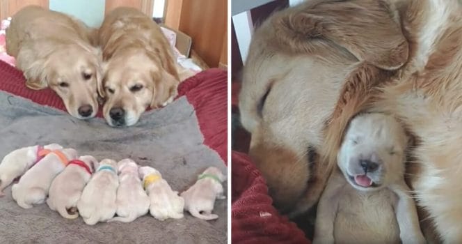 Valplycka: Golden Retriever-mamma och pappa vakar över sina nyfödda älsklingar