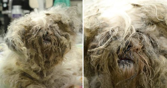 Den stackars hunden var i rysligt dåligt skick. Pälsen var en enda stor tova, hon kunde knappt se och de som räddade henne kunde knappt urskilja vad det var för djur.