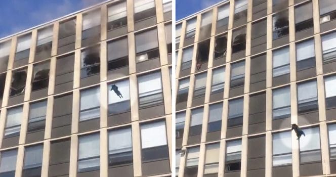 Plötsligt fångade kameran hur en liten katt hoppade ut från femte våningen. På några sekunder var hon nere på marken. Enligt Chicagos brandkår landade katten på gräset, studsade genast upp – och gick sedan därifrån.