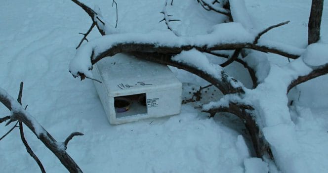 I lådan låg två katter. De var båda mycket frusna och magra där de låg i snön. En okänd människa måste ha ställt in mat åt dem och sedan lämnat dem där…