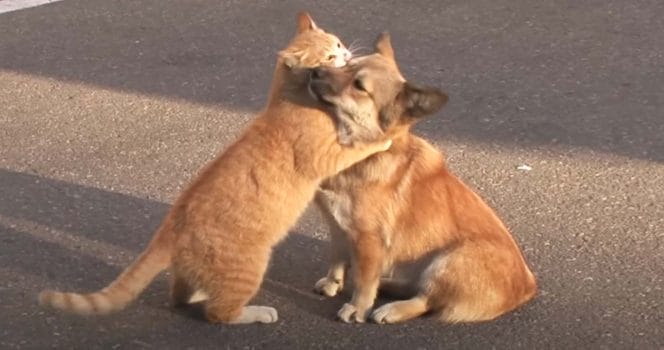 Då dök en katt plötsligt upp. Hon ville uppenbarligen trösta vovven, för vad hon gjorde när hon steg fram till hunden kan inte tolkas som någonting annat än en kärleksgest.