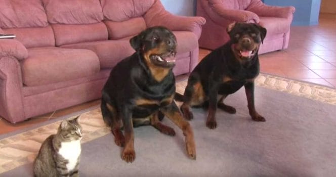 Katten Didga är bästis med två rottweilerhundar och har sett dem lära sig många trick av husse. Hon tycker att det ser så kul ut att hon gärna vill vara med själv.