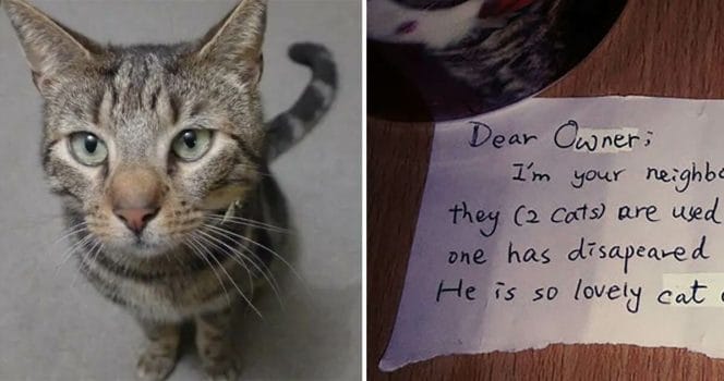 ”Kära ägare; Jag är din granne, bor i 4. Jag är också dina katters nära vänner eftersom de (2 katter) är vana vid att komma till mitt rum varje dag. Men en av dem, en större har försvunnit sedan två veckor. Är han ok? Jag är så orolig för honom. Han är en så härlig katt och berörde alltid mitt hjärta. Hoppas att han mår bra.”