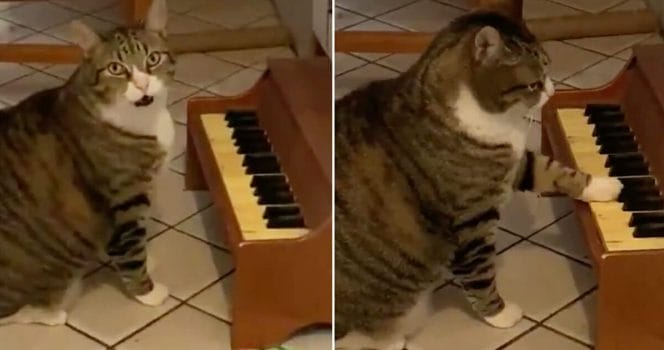 Möt den pianospelande katten som underhåller hela familjen framför tangenterna.