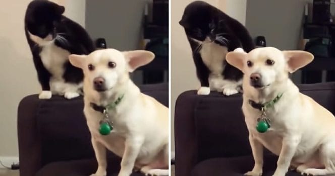 Katten tänker efter länge och noga – men beslutar sig till sist för att peta hunden i huvudet.