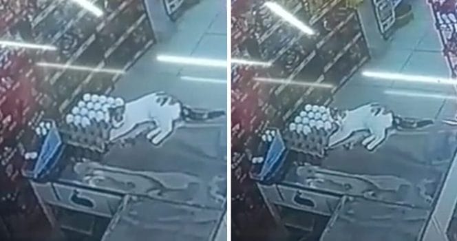 I filmklippet kan man se hur katten plötsligt välter hela flaket med ägg – och butikspersonalen kommer till undsättning. Tyvärr lyckas han inte rädda de 18 äggen.