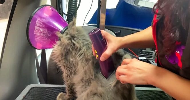 För att komma igenom den matta pälsen ordentligt förklarar frisören att hon använder sig av en specialmaskin.