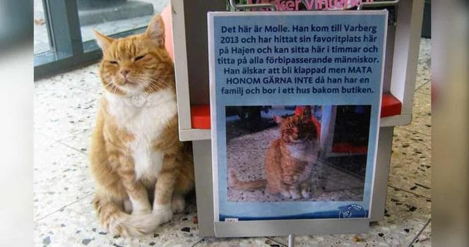 Men Molle har ett hem, och hans familj bor alldeles i närheten av butiken. För att inga kunder ska behöva oroa sig har nu personalen satt upp en skylt bredvid Molle plats. Där kan man läsa vem han är och det finns även en uppmaning om att inte mata honom. Men gos – det får man gärna ge honom.