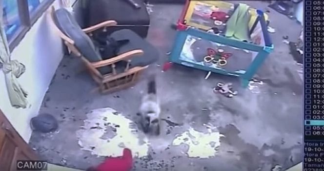 I klippet, som ursprungligen kommer från Kina, kan man se hur en bebis kryper på golvet. Det ser ut som att barnet på något vis har hittat ur från sin spjälsäng. Ingen vuxen tycks heller finnas i närheten. Bara en katt.