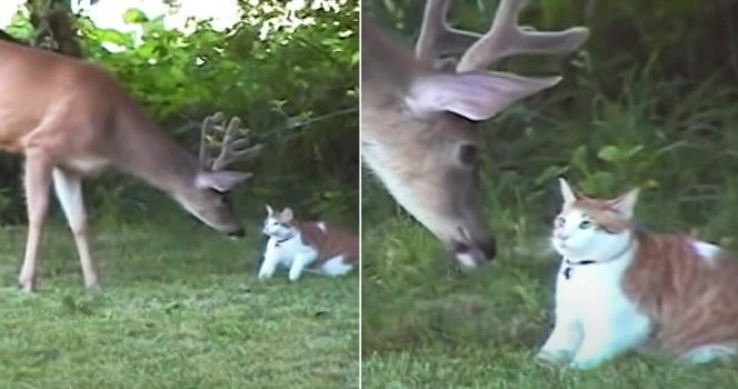 Vad händer om en katt möter ett mycket större rådjur ute i det vilda?